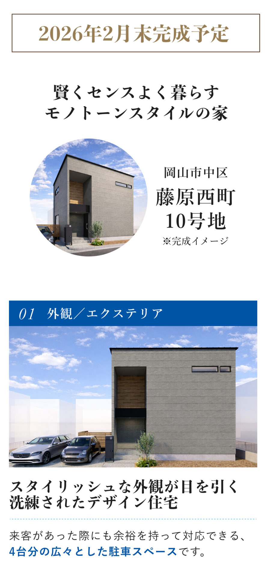 ローソン岡山藤原西町店に接する南側の道路(西国街道)を、西に約50m直進。交差点を越えた位置にある分譲地の入り口を斜め左方向に進んでください。 ※Google mapの案内だと異なる入り口に誘導される場合がございます。ご注意ください。