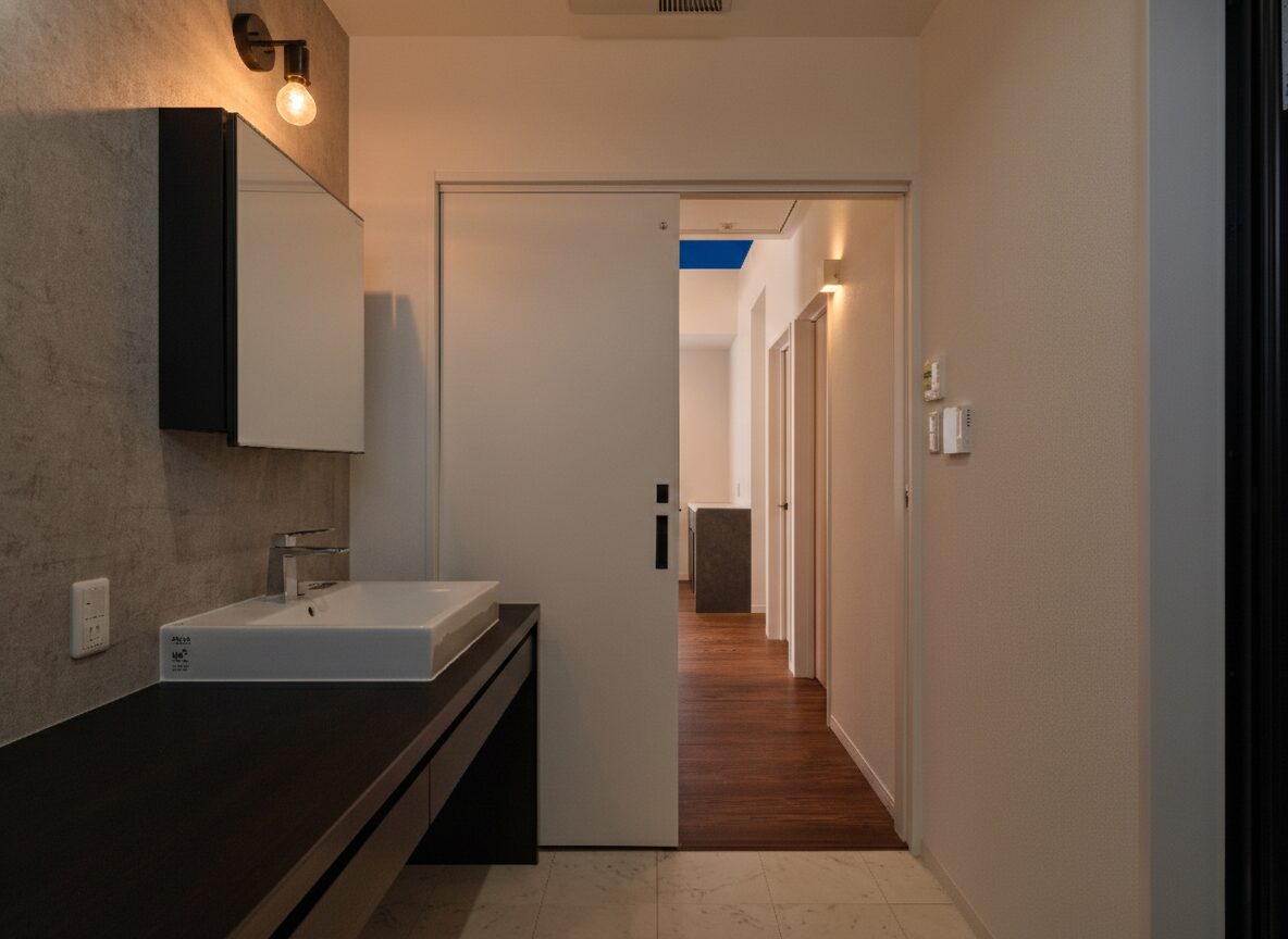玄関を開けて、荷物を置いて、手を洗って… 夜の時間帯に実際に歩いてイメージできるからこそ、動線の使いやすさが実感できます。