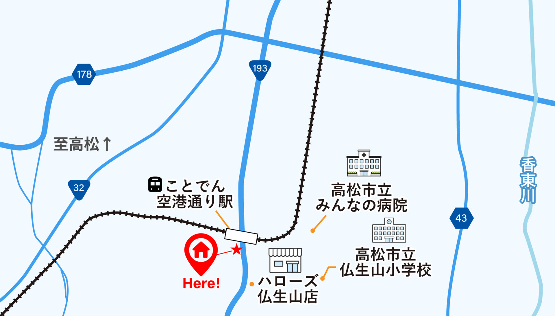 - 高松市中心部から南へ約8km、車で30分程度。大通り沿いで、街中へのアクセス抜群