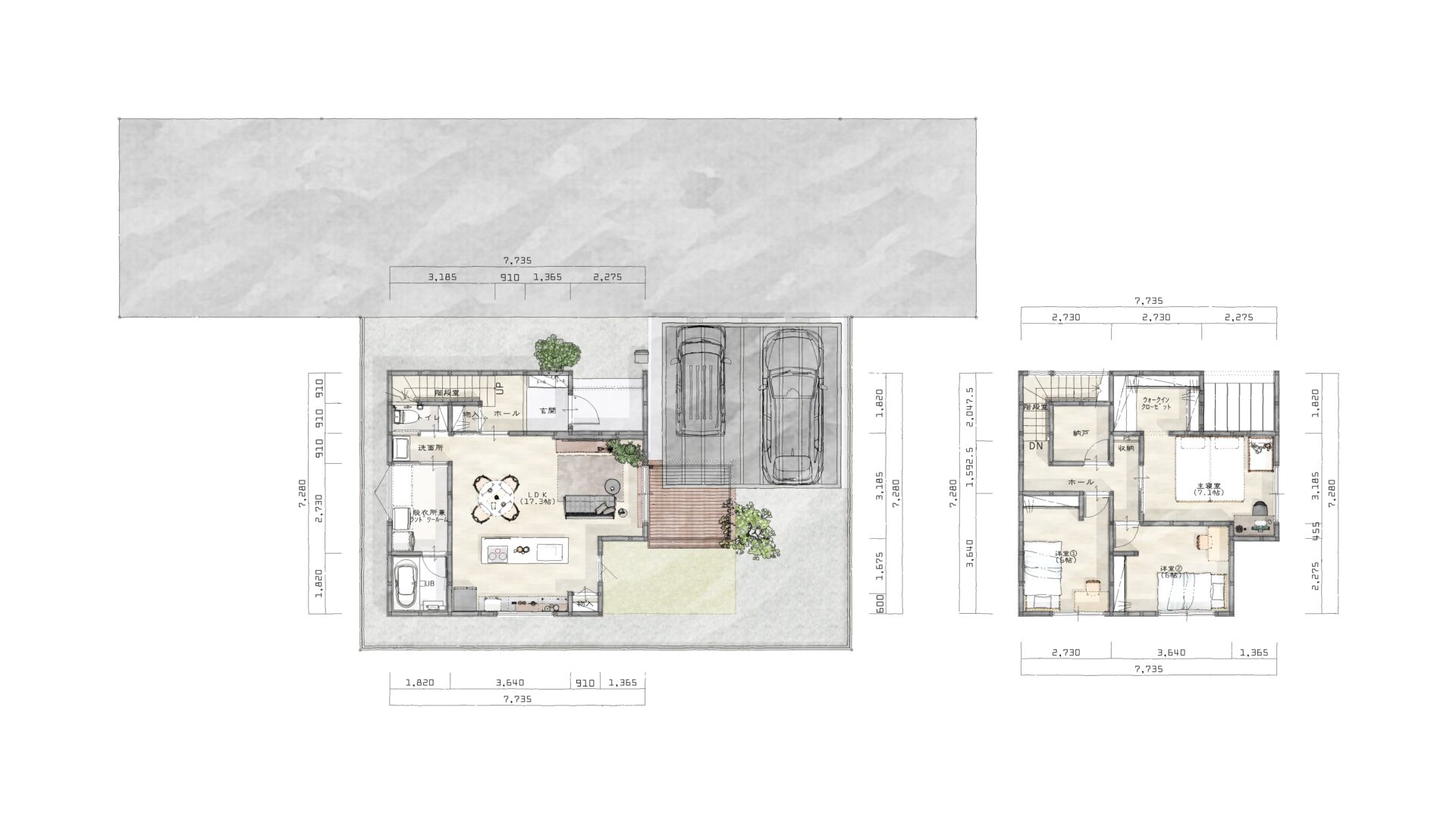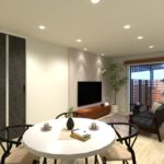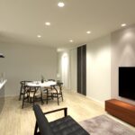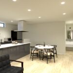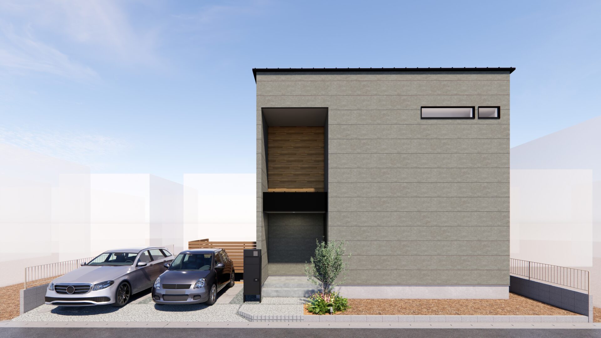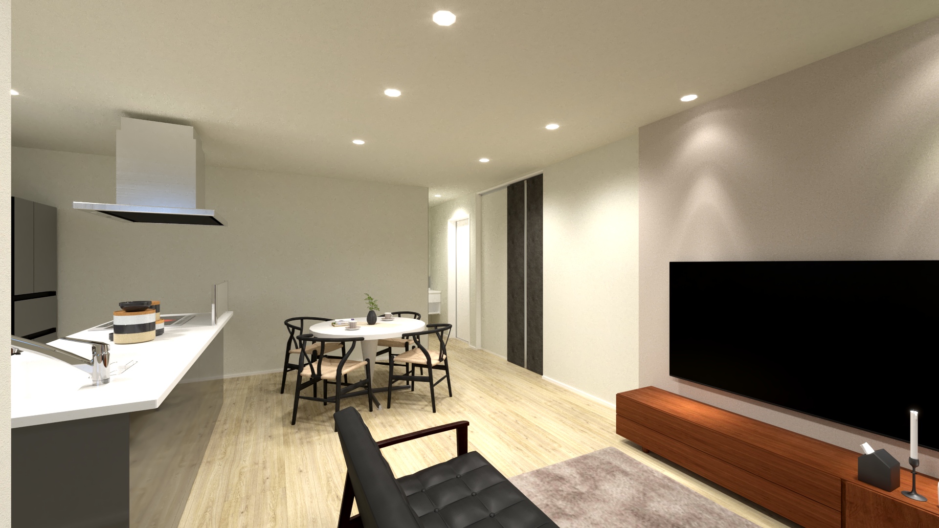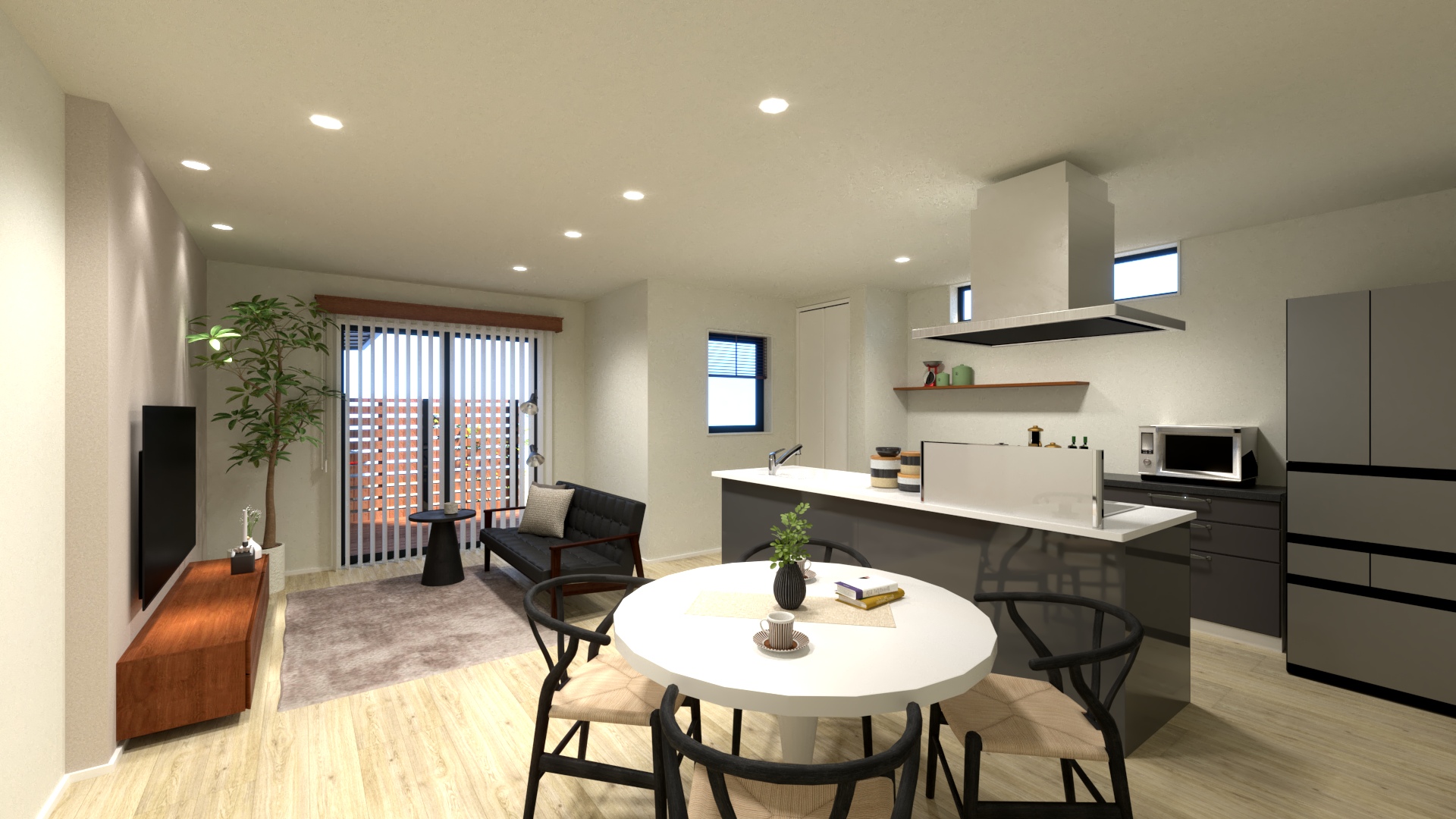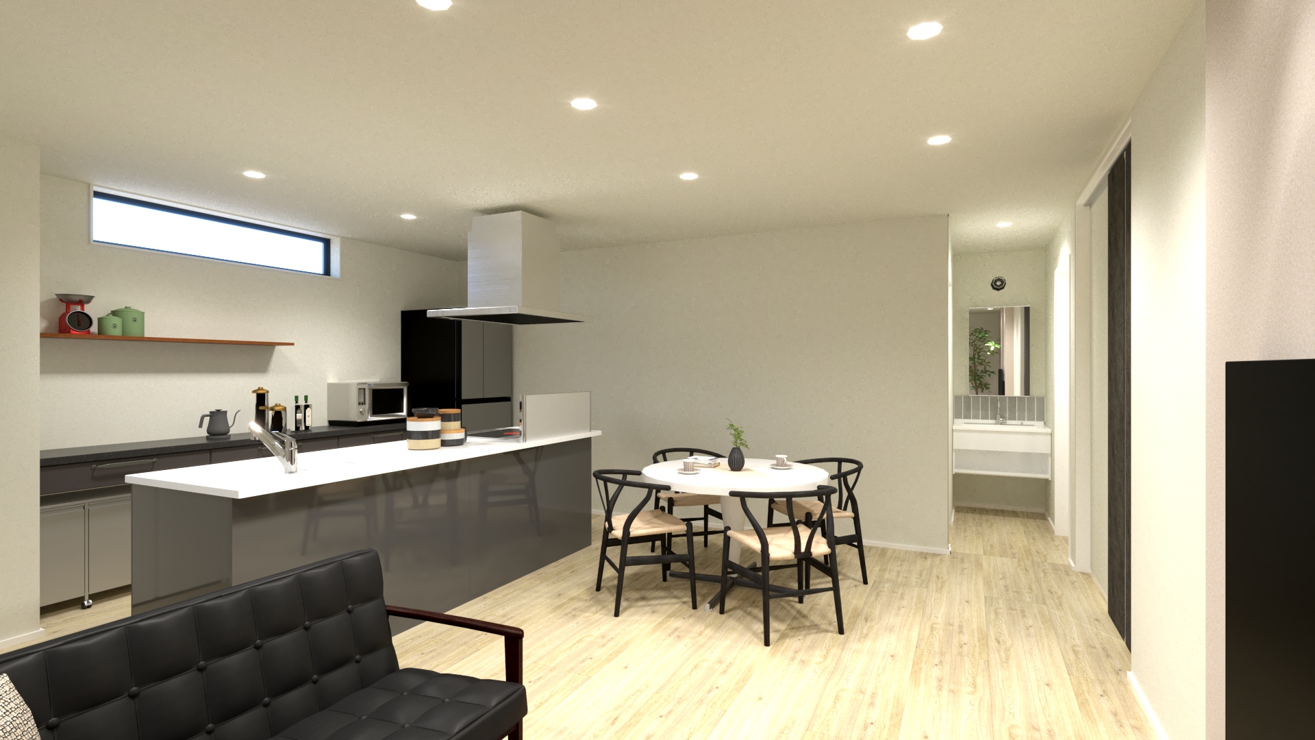 スタイリッシュなモノトーン調の外観・内装が目を引く、洗練されたデザイン住宅。LDKは広々と約17帖あり、中心にはアイランドキッチンを配置し、回遊性のある動線で配膳や家事の効率もアップ。さらに、階段の蹴上げを低く設計することで、将来にわたって快適に暮らせる住まいを実現しました。