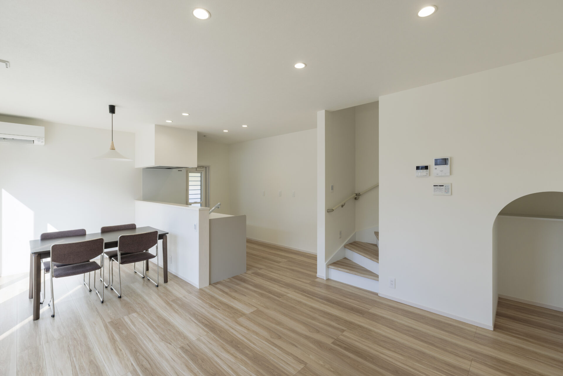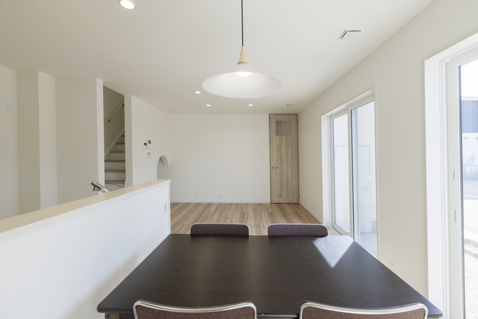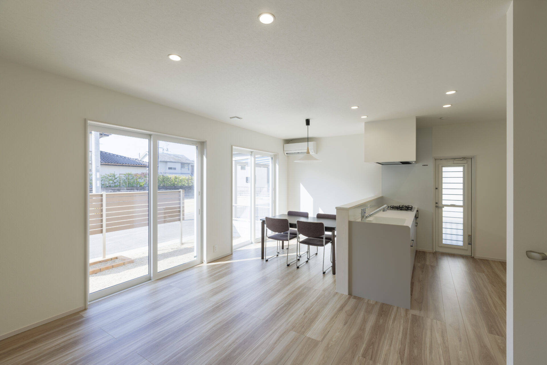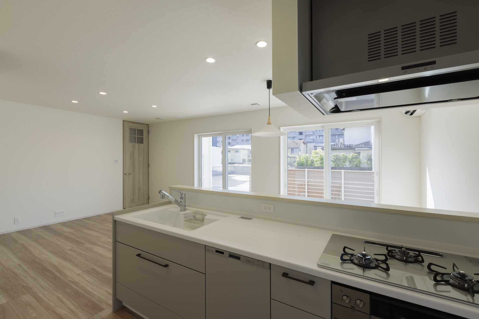 - キッチンからリビング・ダイニング全体と二つの大きな窓が見渡せる開放的な設計