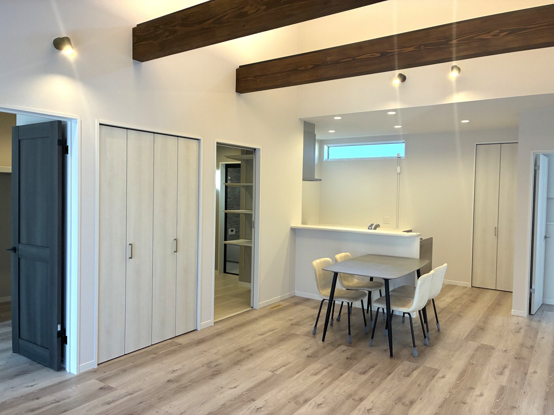 勾配天井を採用した開放的なLDK。木の梁や床がやさしく馴染み、家族で過ごす時間が心地よくなる空間です。