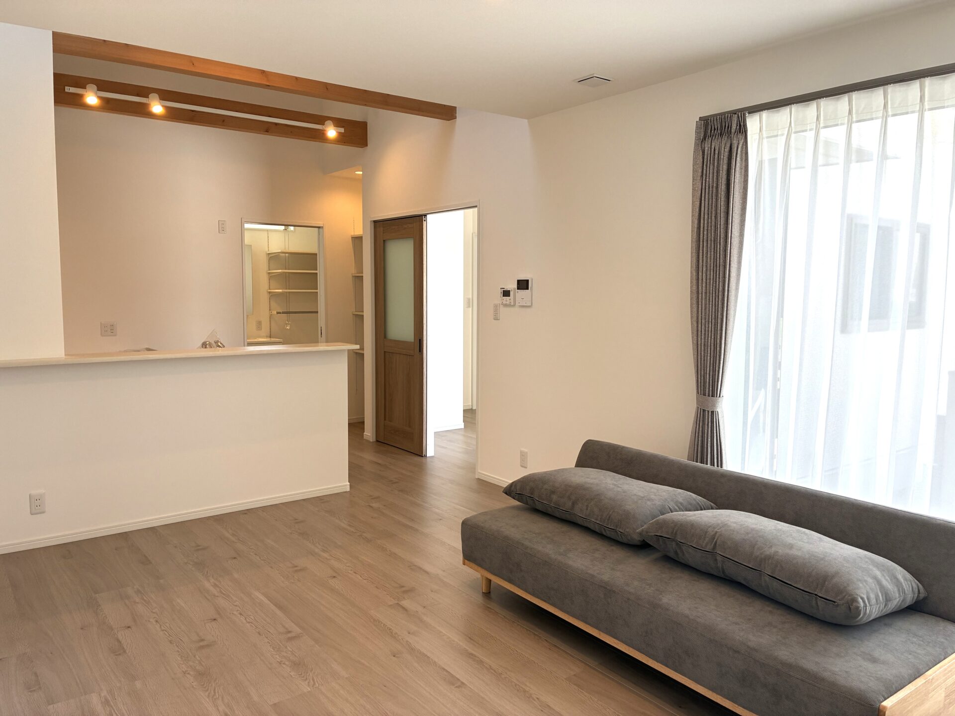 南面の大きな窓から光が差し込む開放感のあるリビングでゆったりとした家族時間を♪