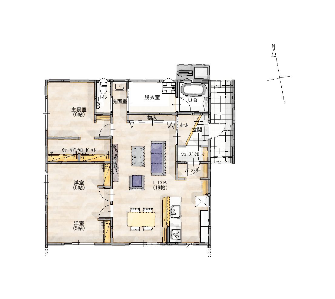 広々19帖のLDK 、シューズクロークやパントリーなど多彩な収納が魅力の平屋で、ゆったりとした家族時間を。