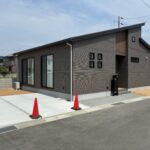 落ち着いた色合いの外壁と南面の大きな窓が魅力のモダンな平屋です。