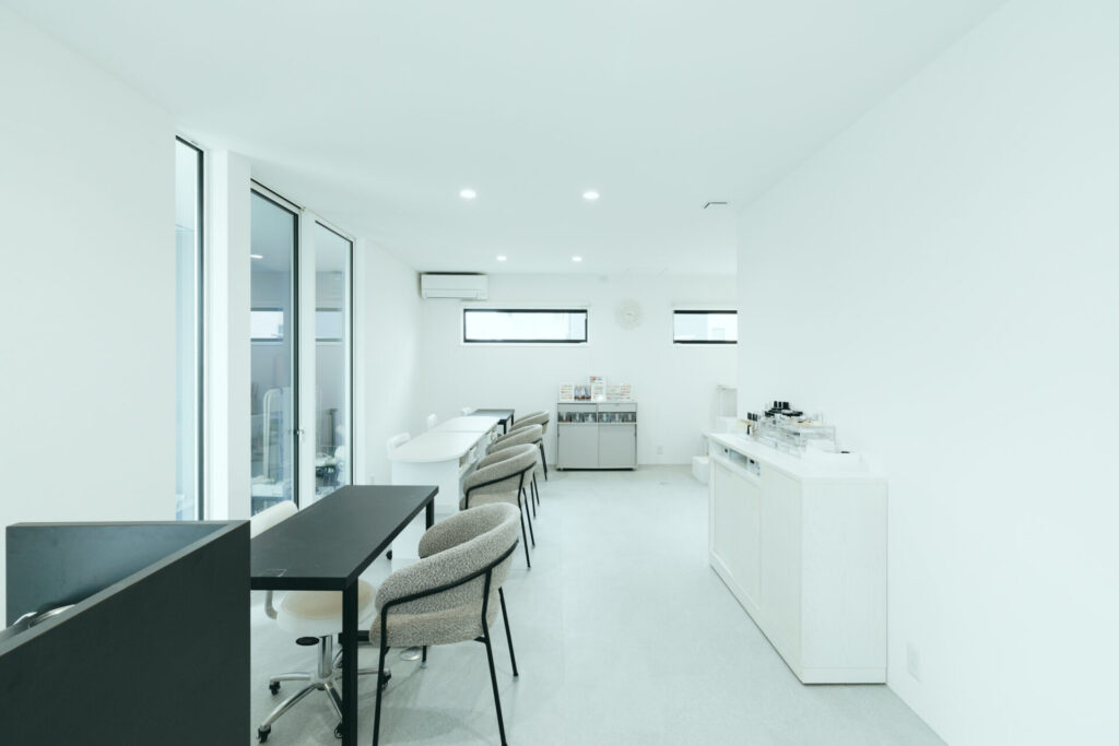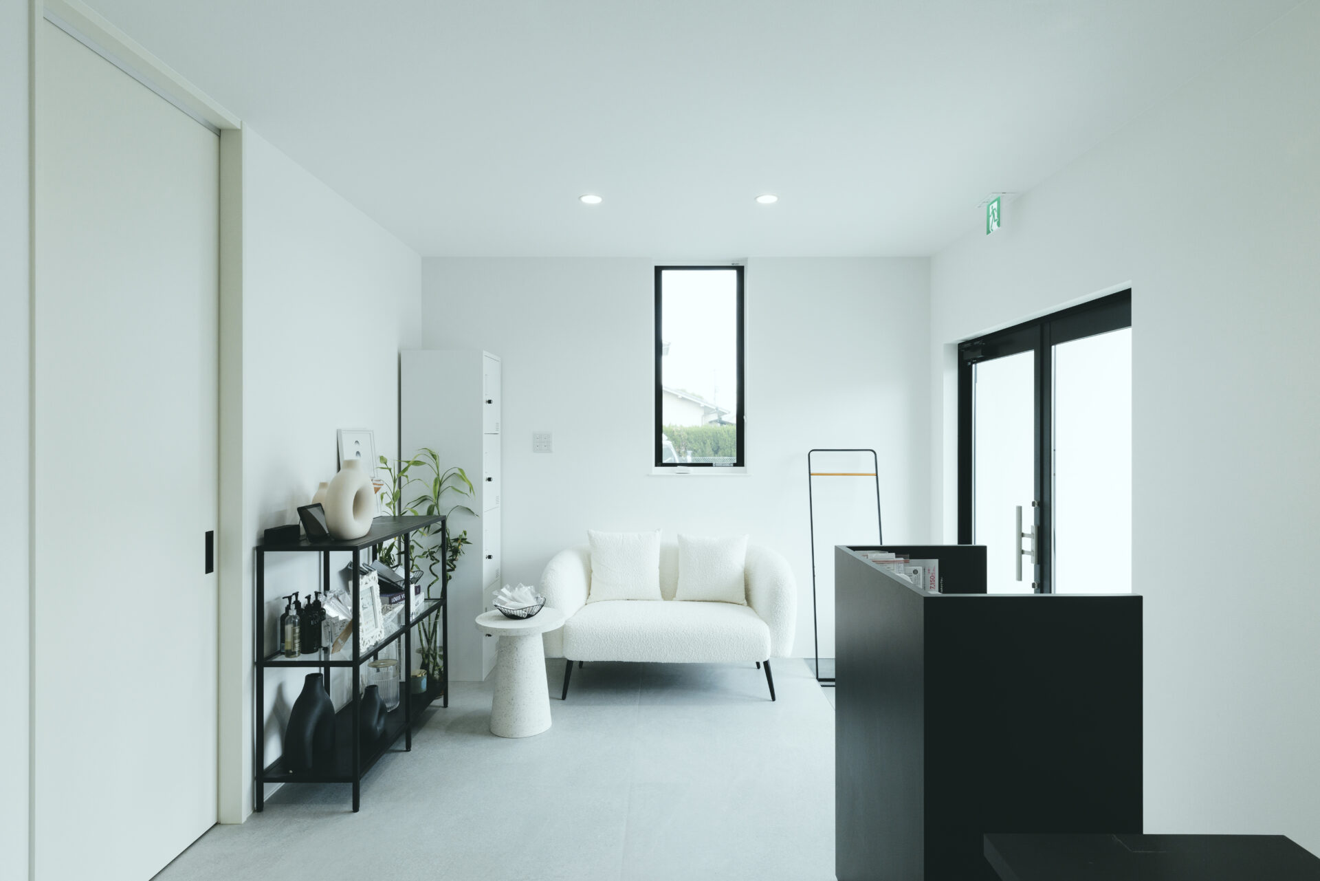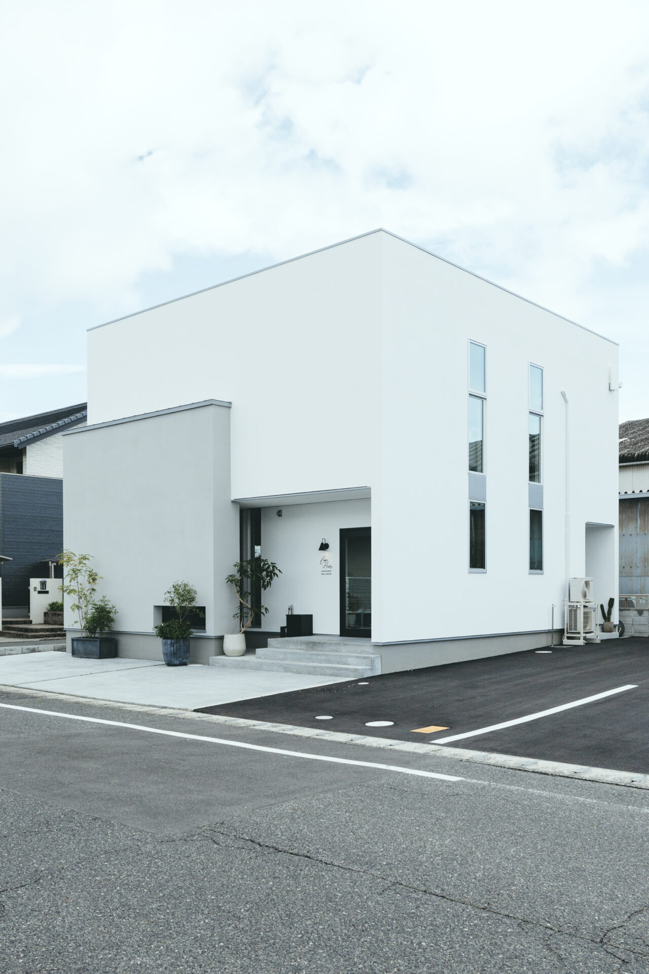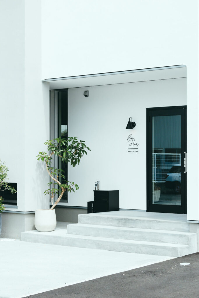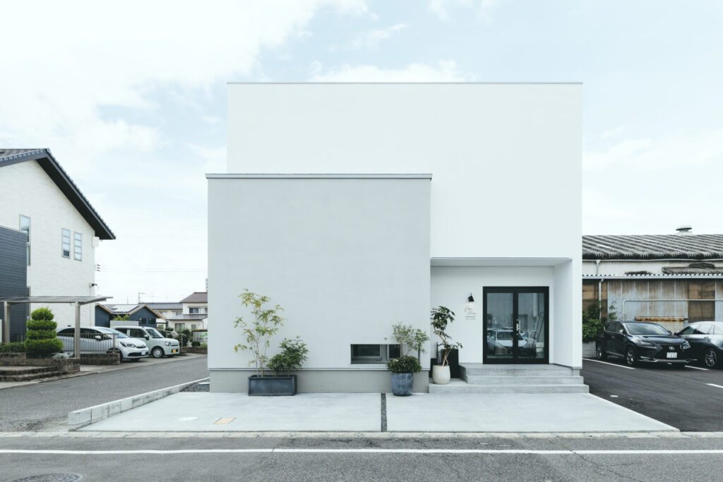 白とグレーの吹付仕上げが生む洗練された外観。ネイルサロンを併用した、住宅間のないモダンな住宅。