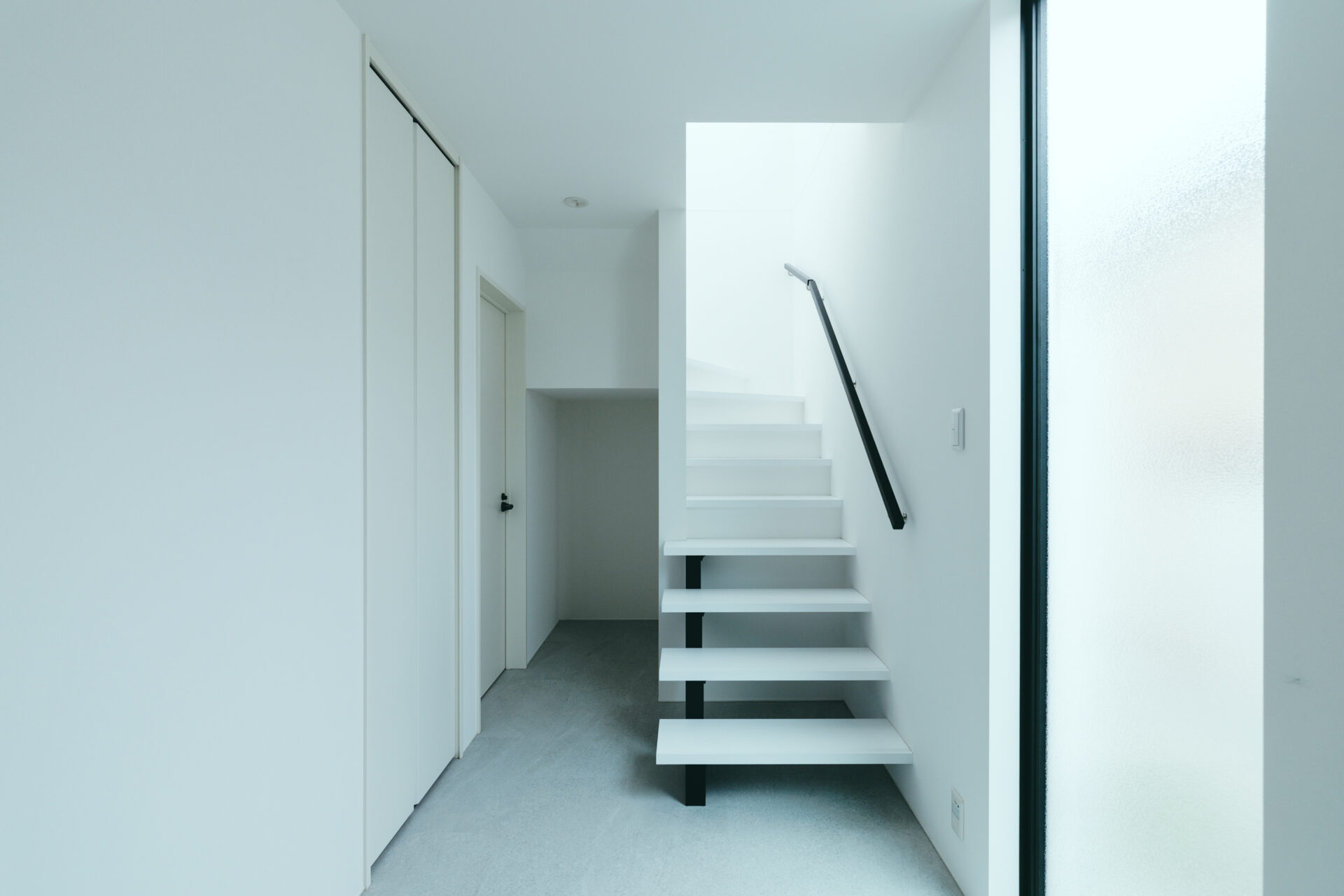 4段のスケルトン階段とブラックの手すりが映えるモノトーン空間。モルタル土間から続く床と大きなFIX窓で、明るく開放的な玄関ホールです。