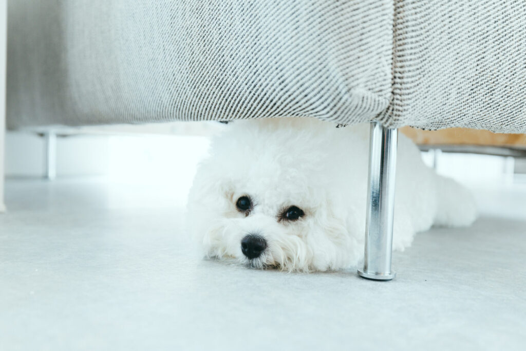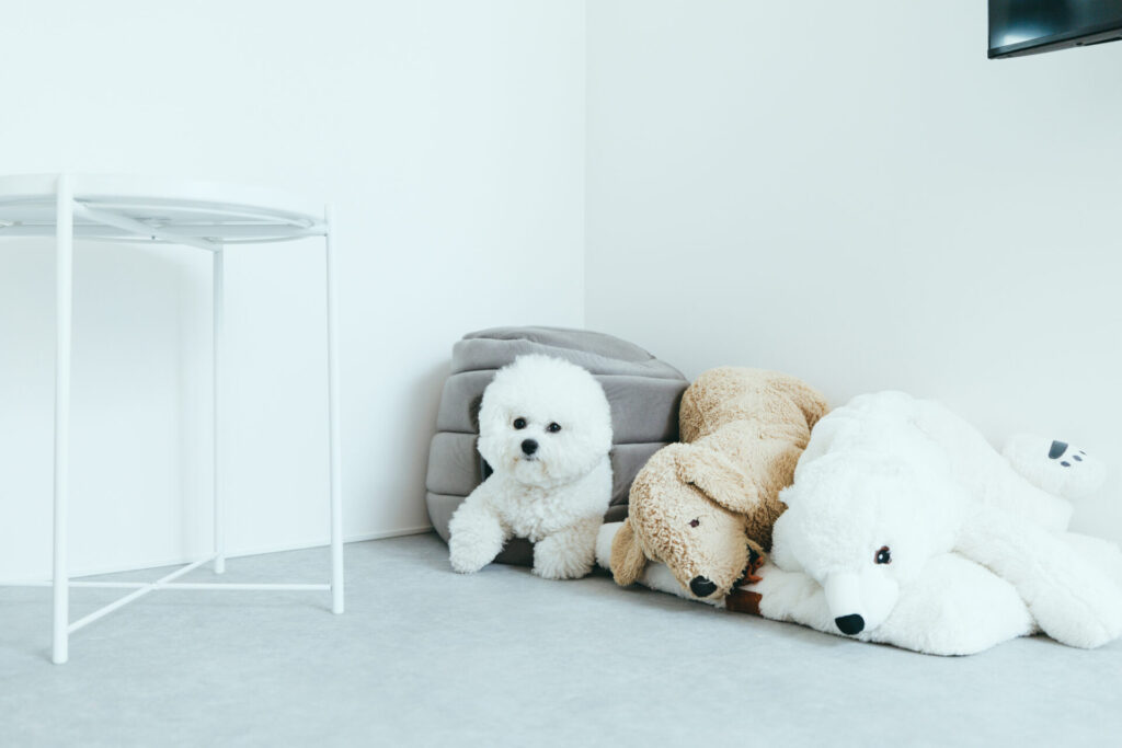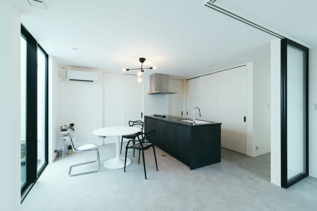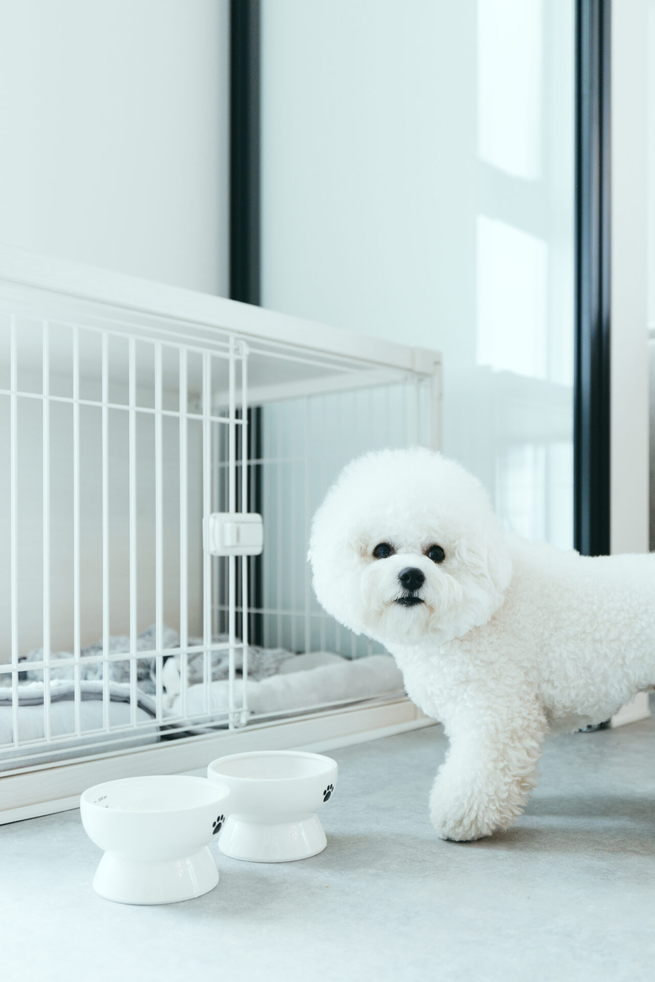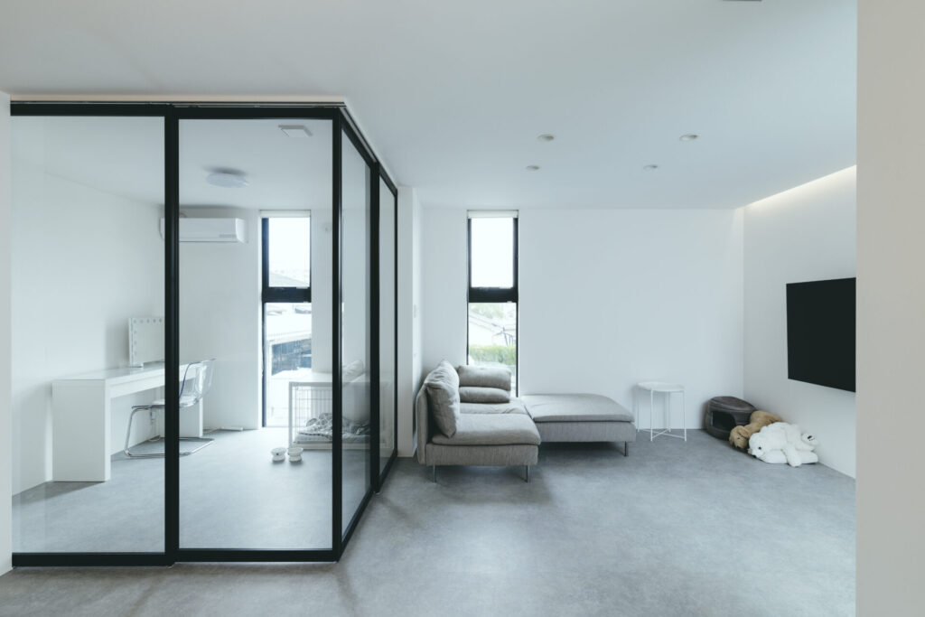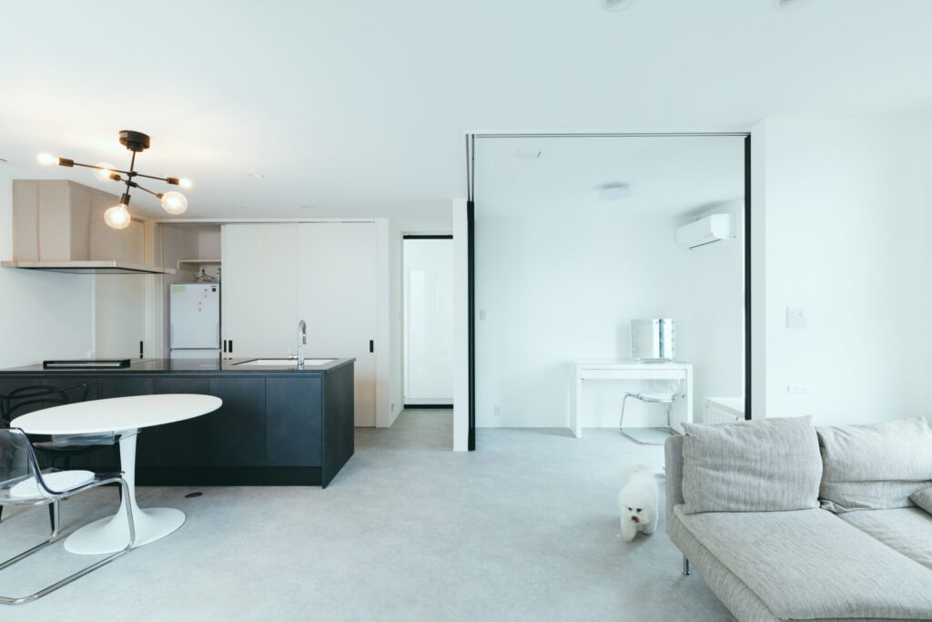 ペットが滑りにくいクッションフロアを採用。施主様が愛犬のために選んだ床材で、モノトーンの空間に快適さとデザイン性を両立しました。