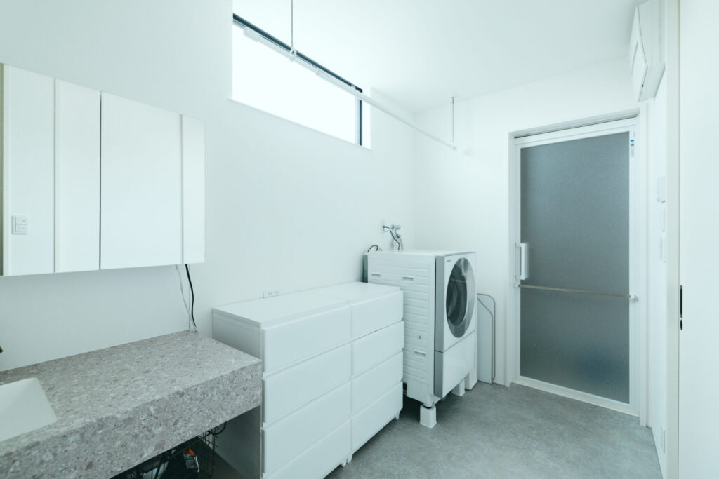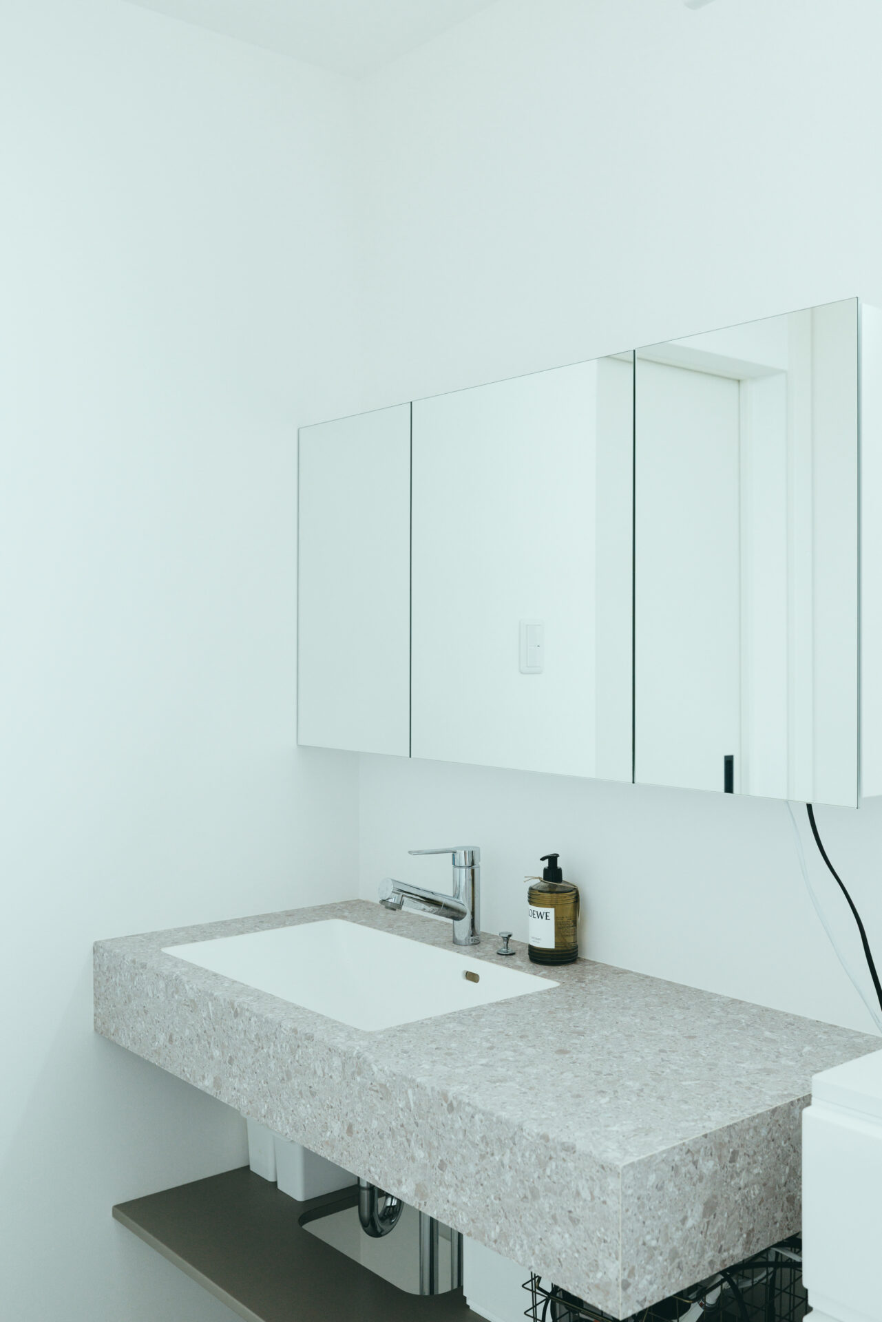 大理石調の洗面カウンターが上質な雰囲気を演出。シンプルなデザインとホワイト基調で清潔感あふれる空間に、ミラーキャビネットで収納力もプラス。