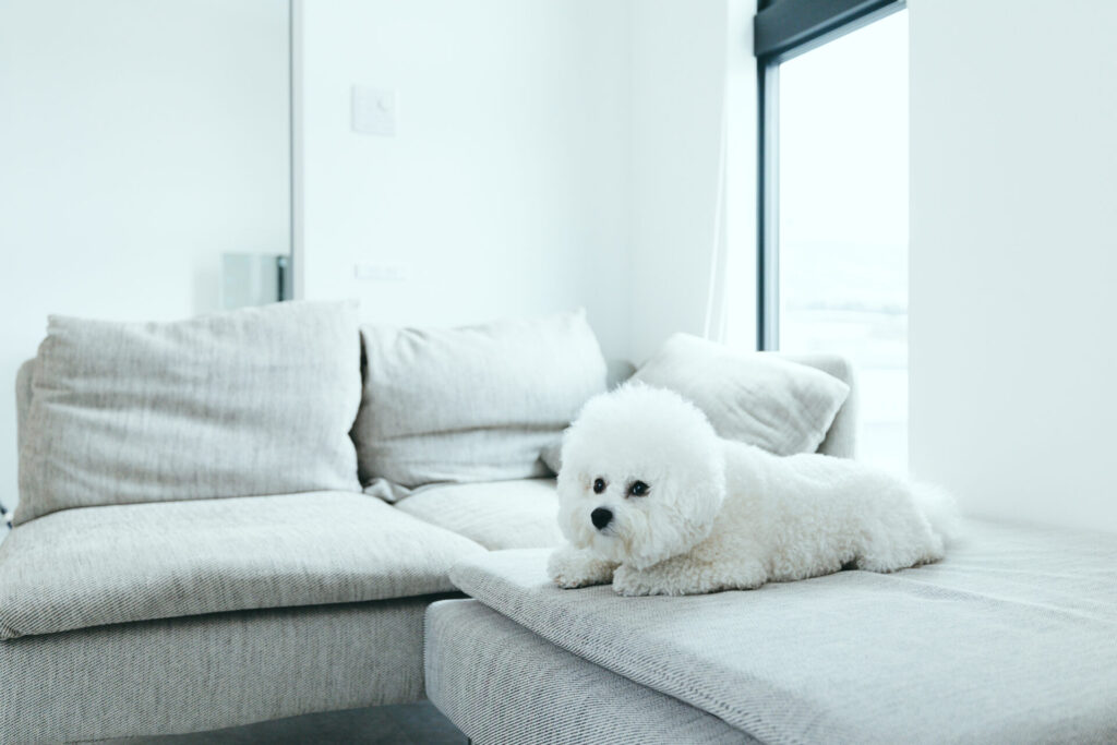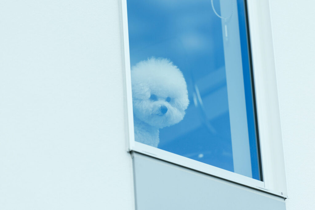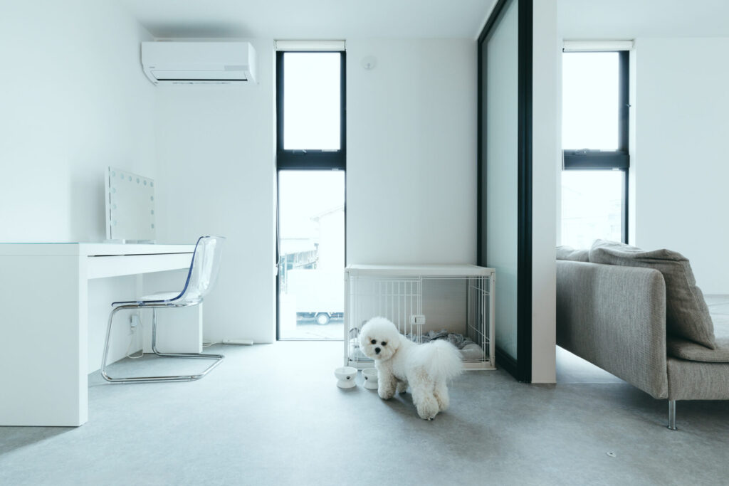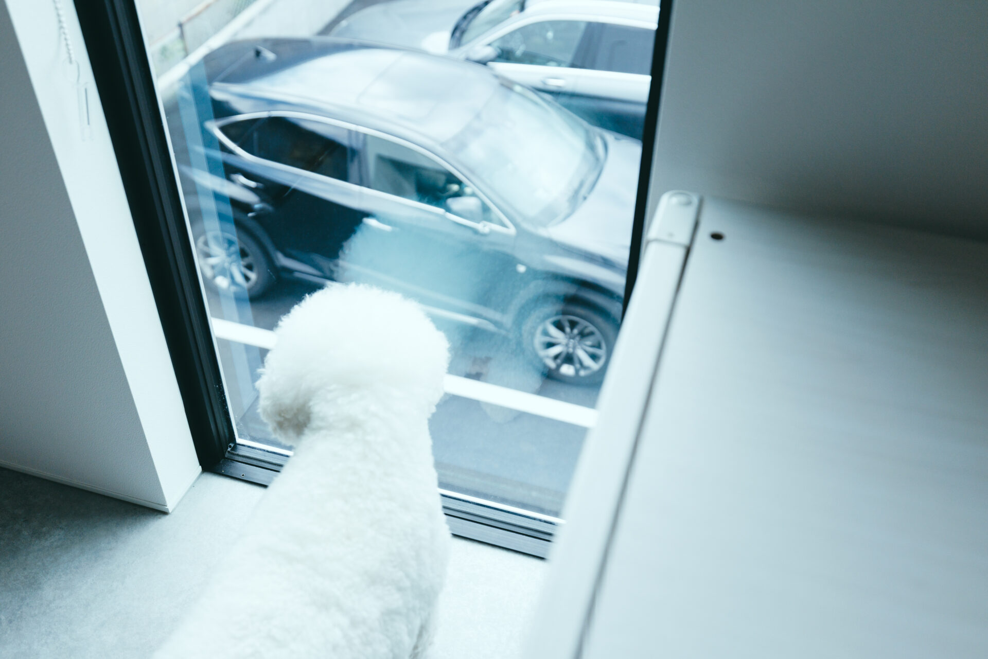 床から天井までの縦長窓が室内に光を届け明るい空間を演出。窓際ではワンちゃんが外を覗き帰宅を待つ愛らしいシーンが広がります。
