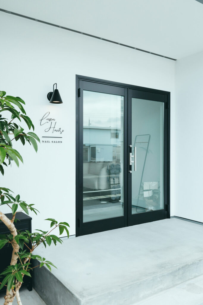 黒のドアと照明がアクセントのモノトーンな店舗玄関。緑を添えて、シンプルながら洗練された印象を与えます。