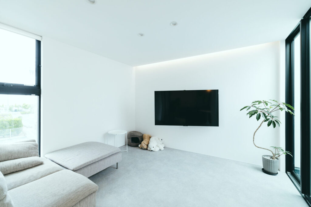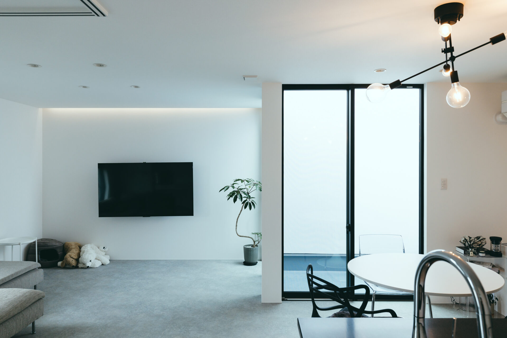 TV上の間接照明が柔らかな光を演出。モノトーンのLDKにガラス仕切りで洋室を緩やかに分け周囲の視線を気にせず使える囲われたバルコニーが暮らしに開放感をプラス。